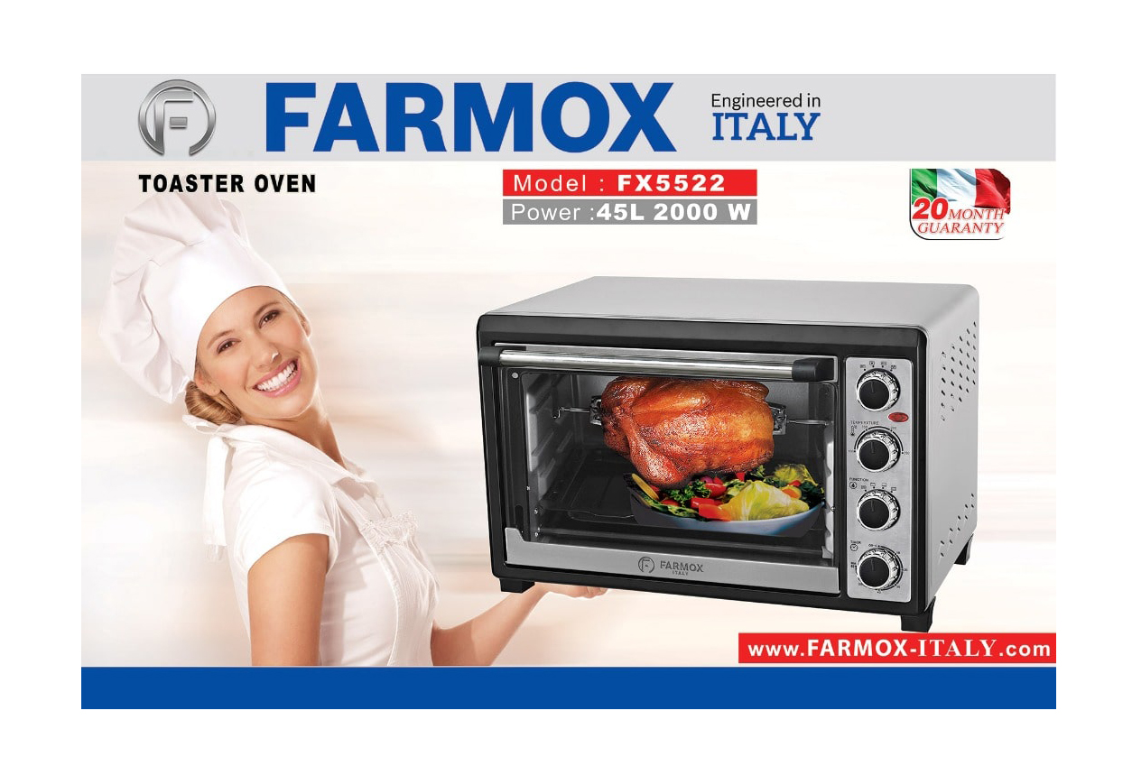 توستر farmox مدل Fx 5522 محصولی با کیفیت و کاملا کاربردی میباشد که با طراحی بسیار زیبا و شیک با پنل آنالوگی که شامل 4 چرخک میباشد ساخته شده است. این مدل دارای المنت های حرارتی پرقدرت است که میتوان به صورت دستی و مجزا آنها را تنظیم کرد. دارای جوجه گردان با موتور پر قدرت و همچنین کانوکشن برای پخش یکنواخت حرارت ، و دارای لامپ داخلی است. از کاربردهای این توستر پخت انواع کیک و شیرینی و پیتزا و همچنین گرم کردن انواع غذاها میباشد، که در هر اشپزخانه ای مورد نیاز است. توستر Fx5522 دارای حجم ۴۵ لیتر است که این امکان را به شما میدهد تا نهایت استفاده را از فضای داخلی آن ببرید.