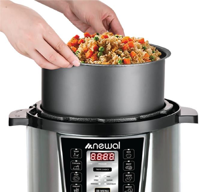 زودبرقی نوال مدل ۱۸۰۳ دارای ظرفیت بالای 6 لیتری می باشد که به لطف این میزان ظرفیت میتوان مقدار بالایی از مواد غذایی را درون آن برای پخت و پز قرار داد. به طور کلی ظرفیت 6 لیتر معادل ظرفیت 8 نفر می باشد. همچنین از بدنه ای از جنس استیل که ضد زنگ نیز می باشد ساخته شده است که بسیار مقاوم و محکم می باشد. بر روی بدنه ی این محصول یک پنل دیجتالی تعبیه شده است. این محصول از یک کاسه گرانیتی نچسب و نسوز که کاملا ضد خش کیفیت عالی است هم بهره می برد. به علاوه توان مصرفی این محصول برابر با ۱۰۰۰ وات می باشد. از دیگر امکانات و فناوری هایی که برای این زودپزو پلوپز نوال Epc-1803 استفاده شده است می توانیم به ۱۵ منوی پیش فرض اشاره کنیم که از این طریق می توانید نحوه ی پخت غذای مورد نظر خود را به صورت پیش فرض انتخاب کنید