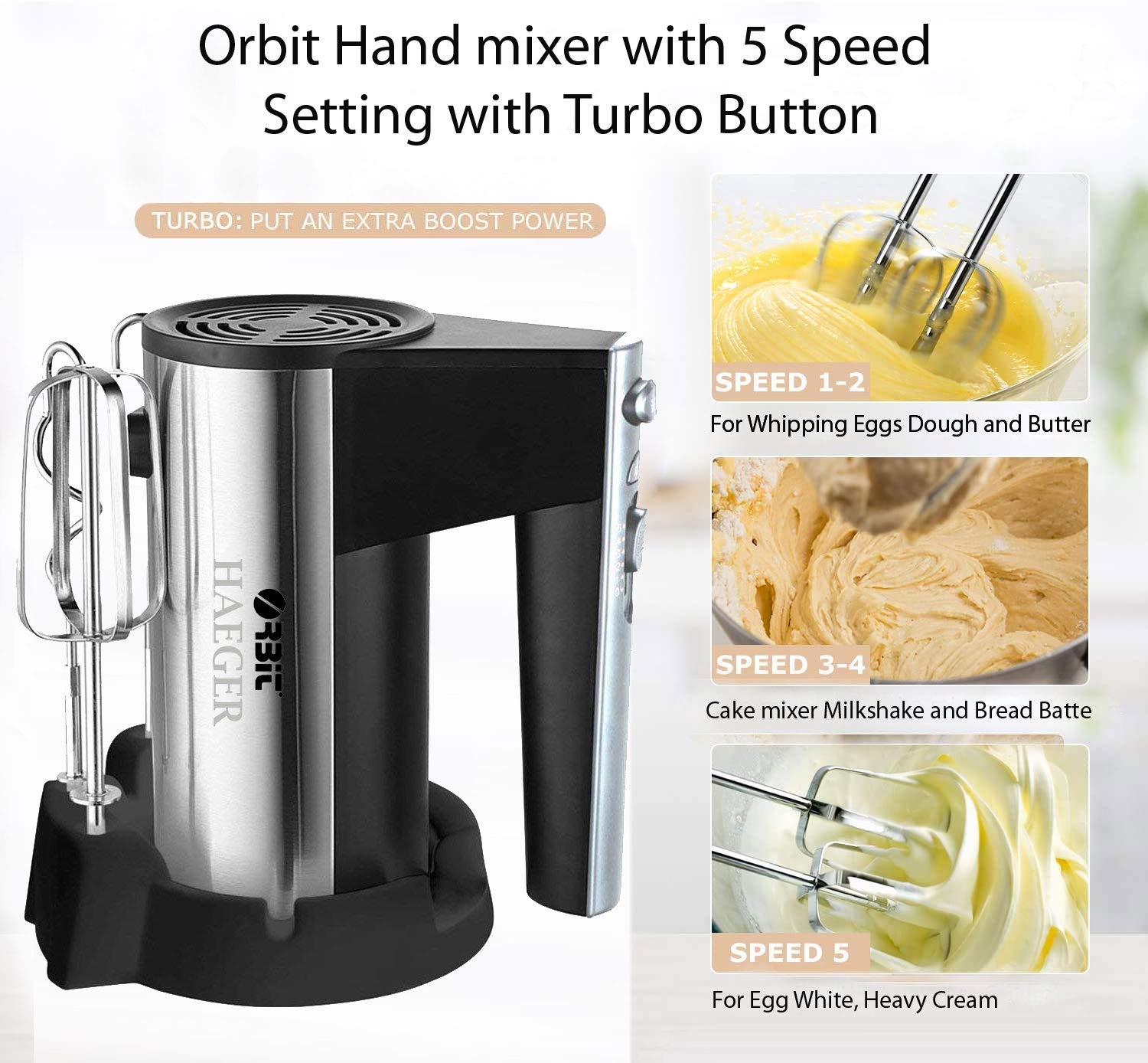همه ما در خانه و در آشپزخانه خودمان نیاز اساسی به یک دستگاه همزن داریم زیرا در ساخت همه کیک ها ، شیرینی ها و انواع دسر و غذاها موادی وجود دارند که باید آن را هم بزنیم و مخلوط کنیم.در خانه خود بصورت کتملا بهداشتی و تمیز و بسیار سریع میتوانید انواع مواد شیرینی و غذایی خود را تهیه نمایید به همین دلیل وجود یک دستگاه همزن با کیفیت برای شما ضروری میباشد. همزن برقی هاگر مدل HG-6629A با داشتن موتور قوی 450 واتی مواد شما را در سریعترین زمان هم میزند و بسیار سریع آماده میکند. با این میکسر بسیار قوی که موتور آن از نوع توربو است میتوانید سرعت را تنظیم و افزایش دهید.