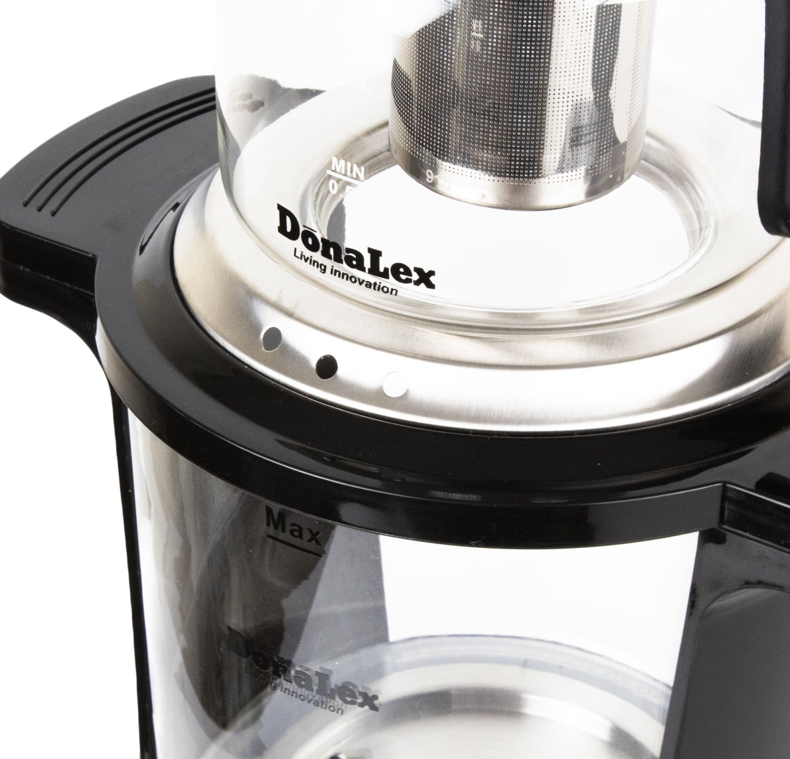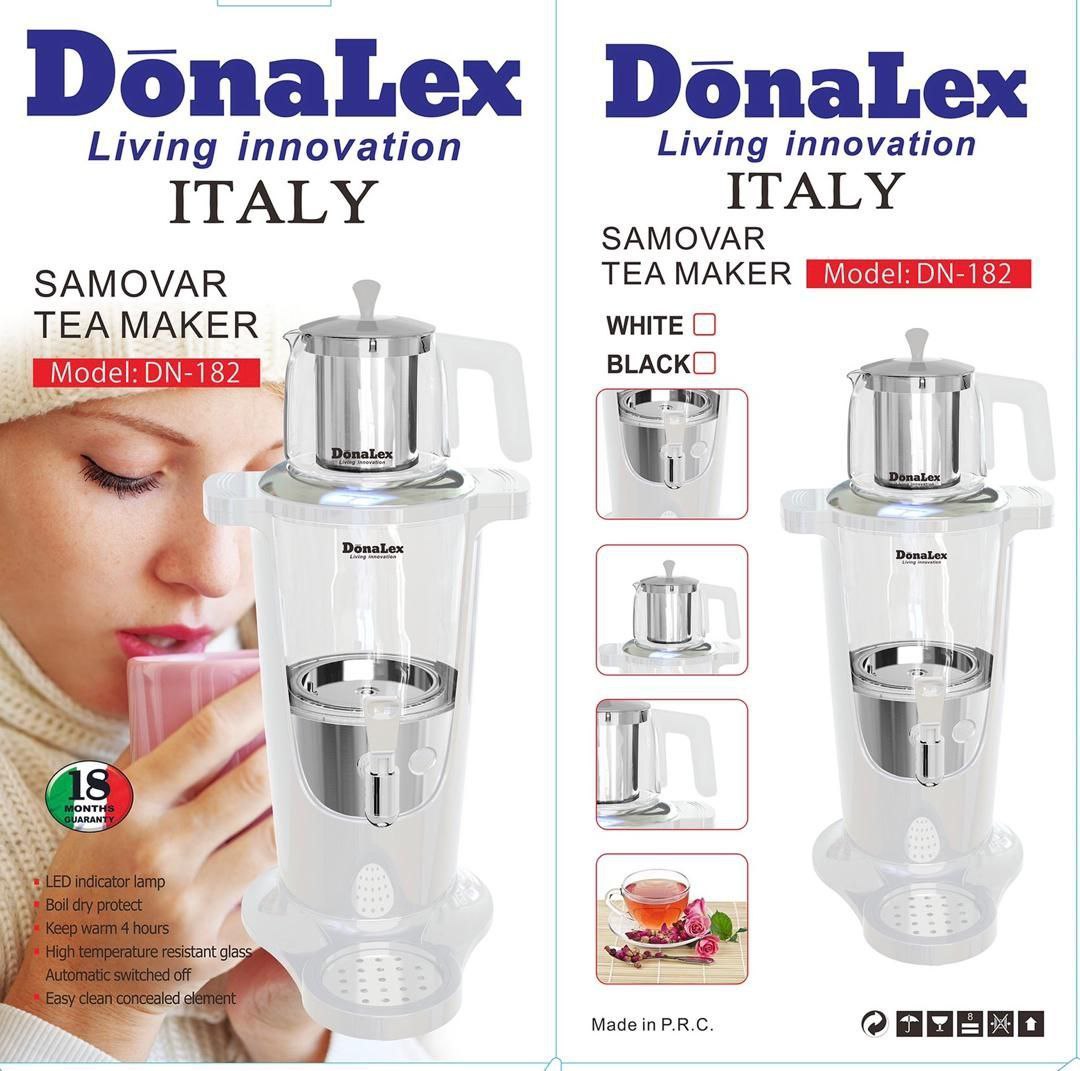 سماور برقی دونالکس مدل DN-182 در دو رنگ سفید و مشکی توسط شرکت دونالکس تولید شده است. این مدل از سماورهای برقی دونالکس توان مصرفی 1500 وات دارند که جنس بدنه آن از پلاستیک عایق و قسمتی هم از استیل ضد زنگ میباشد. این محصول دارای سینی چکه است که به راحتی قابل جدا شدن و تمیزسازی می باشد. در داخل این سماور LED هایی تعبیه شده است که زیبایی خاصی به آن در هنگام کار کردن می بخشد. ظرفیت سماور برقی دونالکس مدل DN-182 که 3.2 لیتر می باشد در مقایسه با محصولات مشابه، حجم مناسبی به شمار می آید. قوری این سماور برقی هم که 1 لیتر حجم دارد، دارای فیلتر استیل ضدزنگ و قابل جدا شدن است. پس از جوش آمدن آب در این دستگاه تنظیمات آن اتومات در حالت گرم نگهداشتن، ست میشود و این فرآیند تا 4 ساعت ادامه خواهد داشت و سپس به طور خودکار خاموش میشود. در پایان قابل ذکر است که در صورتی که سهوا سماور را بدون آب روشن کنید، دستگاه به صورت خودکار خاموش خواهد شد و از این بابت نگرانی نداشته باشید.